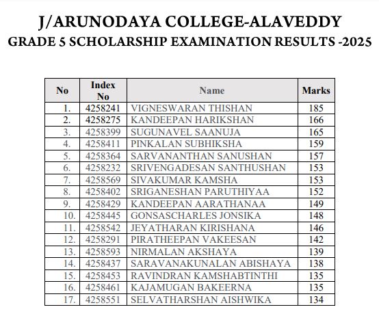 யா/அருணோதயக் கல்லூரி தரம் ஐந்து புலமை பரிசில் பரீட்சை பெறுபேறுகள்